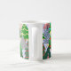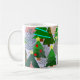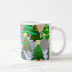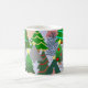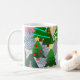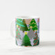 This mug has a design of Christmas trees in various shades of green, pink, silver, and gold with different decorations.