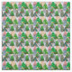 This fabric has a design of Christmas trees in various shades of green, pink, silver, and gold with different decorations.