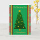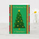 Holiday greeting card of classic Christmas tree adorned with gold ornaments and sparkling star on top. Reds, greens, and golds border the design; "Oh Christmas Tree" and "O Tannenbaum" messages frame the tree.
