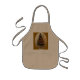 This apron is made with a durable fabric! My grandson LOVES it! The shape provides great coverage to protect clothes from paint spatters, etc. The print quality is excellent! The detailed lines of the dragon drawings are printed in a crisp, clean manner.