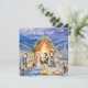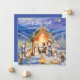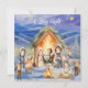 This square greeting card depicts a Holy Night scene of the nativity with cute childlike characters and baby animals.
