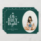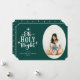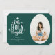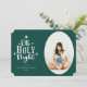 Whimsical typography, traditional holiday quote "Oh Holy Night", Christmas photo card. Card features festive green backgrounds, white text, oval photo frame for single photo on front, template text lines for name, year, message and family names.