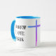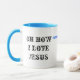 This mug has a beautiful cross in the middle and each side says oh how I love Jesus.