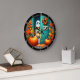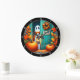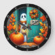 This spooky Halloween clock features a friendly ghost wearing a plaid scarf, peeking out from behind a teal door and holding a lit lantern. Fall leaves and pumpkins are scattered on the ground, and a sign on the door says "OH NO YOU AGAIN". A pumpkin wreath hangs on the door. The clock has a black outer rim with white numbers 1-12.
