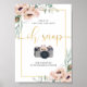 This floral sign for weddings instructs your guests regarding a hashtag to use when taking photos at your wedding. It features lovely corner bouquets of pastel peach and pink poppies and greenery with pretty script font spelling out "Oh snap".