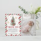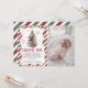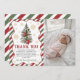 A festive holiday-themed thank you photo card featuring red, green, and white striped borders, elegant Christmas greenery with red bows, and gold snowflake accents. The design includes space for a personalized baby photo, making it perfect for winter or Christmas first birthday celebrations. Ideal for sending gratitude to guests after a seasonal party and customizable with your message.
