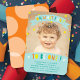 This fun and colourful first birthday design features bright typography and confetti dots in blues, greens and tangerine orange.