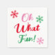 This festive holiday paper napkin features modern calligraphy script that says "Oh What Fun!" in pink, red, and green with coordinating snowflakes. The look is fun, modern, and festive!