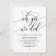 Elegantly announce your happily ever after with our modern black and white theme wedding elopement celebration invitation card, "Oh yes we did". Tailored for couples continuing their love story, this invitation strikes a perfect balance of sophistication and charm, setting the scene for an unforgettable event. Featuring a modern contemporary script design, it adds a touch of timeless grace to your special day. Designed by the talented TeeshaDerrick, this invitation is a stylish expression of your enduring love.