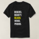 I give wanted to give this a 4 instead of a 5 because these Basic DARK T0shirts run unexpectedly SLIM or Narrow. Which is great if you do not have a potbelly, but I have a paunch. It isn't the shirt's fault that I've got a beer belly. The design and shirt itself is a quality cotton shirt. The color is more of a deep purple, but still a very pretty color. The Basic DARK T-shirts run a bit SLIMMER than the Basic Ts. The neck is a fraction narrower (or seems to be narrower) also. I'm a paunchy middle-aged woman and my neck is 12 inches (31cm) thick and the neckline fell about the same as in the photo of the man, and I had the desire to tug it a bit. So if you're a thick necked man or like loose shirts, be aware these are slimmer shirts. Once I get rid of my lockdown paunch it'll look great. The shirt washed well in cold water with no apparent bleeding. We don't have a dryer, so it hung dry. Did not shrink. Love the colors and the design. The design looks smaller on my shirt than it does on the model on-line. But still, it looks good on the shirt. The printing looks as it does on the model, just the size seems fractionally smaller. Washed garment in cold water, hung dry and design appeared unaffected.