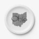 These Ohio themed paper party napkins feature the outline silhouette map shape of the state of Ohio filled in with a grey textured background that looks like an old chalkboard with the name of the state written across the front in a black script font.