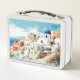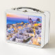 Nice white lunchbox for kids with 2 different picture of Santorini, Greece. Sunset in the most beautiful location in Greece.