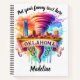 A vibrant depiction of a tornado spiralling above Oklahoma City's skyline, blending urban architecture with natural power. The colourful artwork captures the essence of the region's weather.