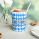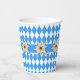 Oktoberfest paper cups done in the traditional Oktoberfest blue and white diamond checked pattern, with graphics of the white Alpine flowers called Edelweiss, running across the middle.