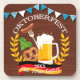 Oktoberfest beer festival with a beer mug, pretzel, sausage, a ribbon banner with the German flag colours, and Bavarian flags on the top to celebrate Oktoberfest in the fall.