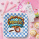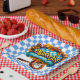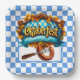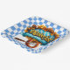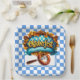 A Colorful Oktoberfest Square Paper Plate With Sausage On A Fork