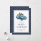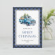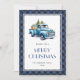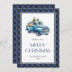 Blue buffalo plaid Merry Christmas card featuring a blue retro truck. Easily personalise this snowy holiday card with your family name and the year.