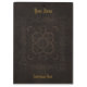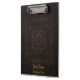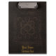 A clipboard printed with the image of an old book cover made from brown tooled leather with ornamental patterns, and optional golden text.
