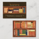 Professional business card for a bookstore, used books shop, library or librarian, teacher or writer, featuring a vintage illustration of colourful old books on antique wooden bookshelf.