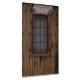 Old knotty brown oak mediaeval Spanish door with a centre window covered with black wrought iron bars.