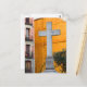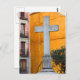 Old cross from 18th century against a vivid orange wall at the Plaza de Puerta Cerrada in the old part of Madrid in Spain.