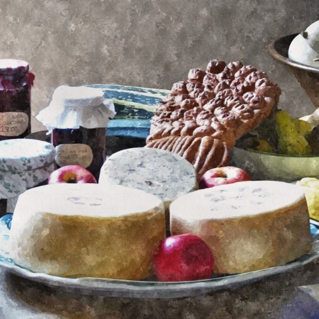 Farmhouse food from the 1800's, cheese, apples, squashes, preserves and harvestime bread. Watercolor. England UK.