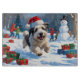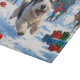 A fluffy Old English Sheepdog runs happily through the snow, wearing a bright red Christmas hat. The playful winter scene showcases the breed’s shaggy coat, gentle nature, and joyful spirit while capturing the festive magic of the holiday season. A charming design full of warmth and cheer.