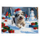 A fluffy Old English Sheepdog runs happily through the snow, wearing a bright red Christmas hat. The playful winter scene showcases the breed’s shaggy coat, gentle nature, and joyful spirit while capturing the festive magic of the holiday season. A charming design full of warmth and cheer.