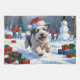 A fluffy Old English Sheepdog runs happily through the snow, wearing a bright red Christmas hat. The playful winter scene showcases the breed’s shaggy coat, gentle nature, and joyful spirit while capturing the festive magic of the holiday season. A charming design full of warmth and cheer.