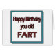 Cute "Happy Birthday You Old Fart" Design. All of our images are available on mens,ladies,kids, baby t-shirts and other apparel. We also offer our designs on mugs, hats, ties, pins, bags, mousepads, stationary, stamps, and more.