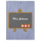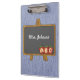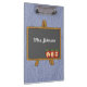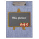 Stylish teacher's clipboard, with graphics of a blue denim background and cute cartoon like graphics of an easel style chalkboard. Personalise the white text, on the chalkboard, to suit your needs.