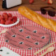 Old fashioned country Christmas trees paper plates in red! Red background. In black with white shading: Christmas trees in pots with old fashioned candles. The words "It's a Country Christmas" in black and two types of typography.