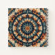 A vibrant geometric quilt pattern radiates from the centre, creating an intricate mandala design with various colours, including teal green, rust brown, and beige shades.