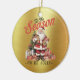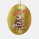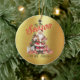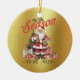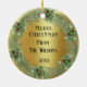 This ornament is a great gift for friends, families, coworkers. It features an old fashioned Santa Claus in front of the Christmas tree with presents all round him. Typography says "Tis the Season to be jolly". The background is gold foil. The back of the ornament says "Merry Christmas from" and then you personalise it with your name or family name and the year. The writing is surrounded by a lovely green pine wreath with berries around the edge.