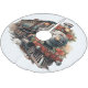 Tree skirt with an illustration of an old vintage steam train. Decorated with red Christmas flowers.
