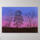 An ACEO watercolor painting of an old fence row and autumn trees silhouetted against the pinks and deepening blues of the evening, twilight sky.
