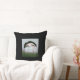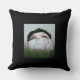 Photographic on black pillow. Graphic, copyright by Debbie Hupp, Black and white, slight pink tint on face.