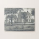 This vintage look puzzle design features a depiction of an old fashioned style house, trees, and a lawn.