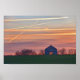 An old Kentucky barn greets the dawn from its perch on a hilltop in a green pasture. A modern touch in the colourful sky are aircraft contrails adding to the clouds.
