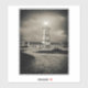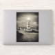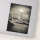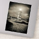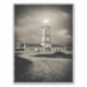The black-and-white tones of the image intensify the mood of isolation and resilience. Heavy clouds loom overhead, suggesting the presence of strong winds and turbulent seas nearby. Yet despite the threatening atmosphere, the lighthouse remains steadfast, its bright light piercing the darkness.