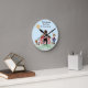 An adorable clock for your baby's nursery. Old McDonald is standing in the front of his barn, with a cow, a rooster and pig. There's a chicken in the hayloft and one on the roof. The sun is smiling in the sky and it says "Old MacDonald Had a Farm E - I - E - I - O.