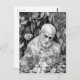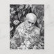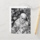 Postcard features an AI generated digital black & white, pencil & charcoal illustration features an old man sans clothing, surrounded by lush leaves and flowers.