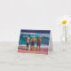 A card based on a colourful painting of three older men standing and looking at the crashing waves at the beach.
