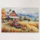 A beautiful vintage art jigsaw puzzle for the serious puzzle person who loves country settings, old barns or vintage pickup trucks, this puzzle has tall late summer grasses in a field where an old red pickup truck is parked with a red barn and hills in the background, all in an autumn setting.