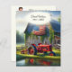 Old red tractor by a rustic wooden farm barn with an American flag.
