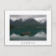 Postcard of a landscape with an old rowboat in a lake with the reflection of the mountains in the still water, Hjelle, Norway with a white border and the text: 'Norway'.