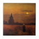Old Tower In The Fields by Vincent van Gogh is a vintage fine art post impressionism landscape nature painting. A peasant woman farmer is walking at sunset after a long hard day working in the fields on a farm. There is a building behind her in the distance. The setting sun is in a hazy sky behind clouds and resembles a full moon with it's glow through the hazy clouds.