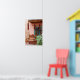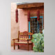 This quintessential Old Town Albuquerque, New Mexico, scene features hanging dried red pepper ristas, adobe walls, a carved colorful wooden bench, a prickly pear cactus, brick patio, tin roof and a turquoise window frame.