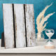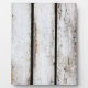 Old worn white painted wooden boards with space between. Dirty and with flaking paint. Photography.