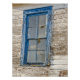 Broken panes and reflections in an old window framed with blue peeling paint and loads of texture